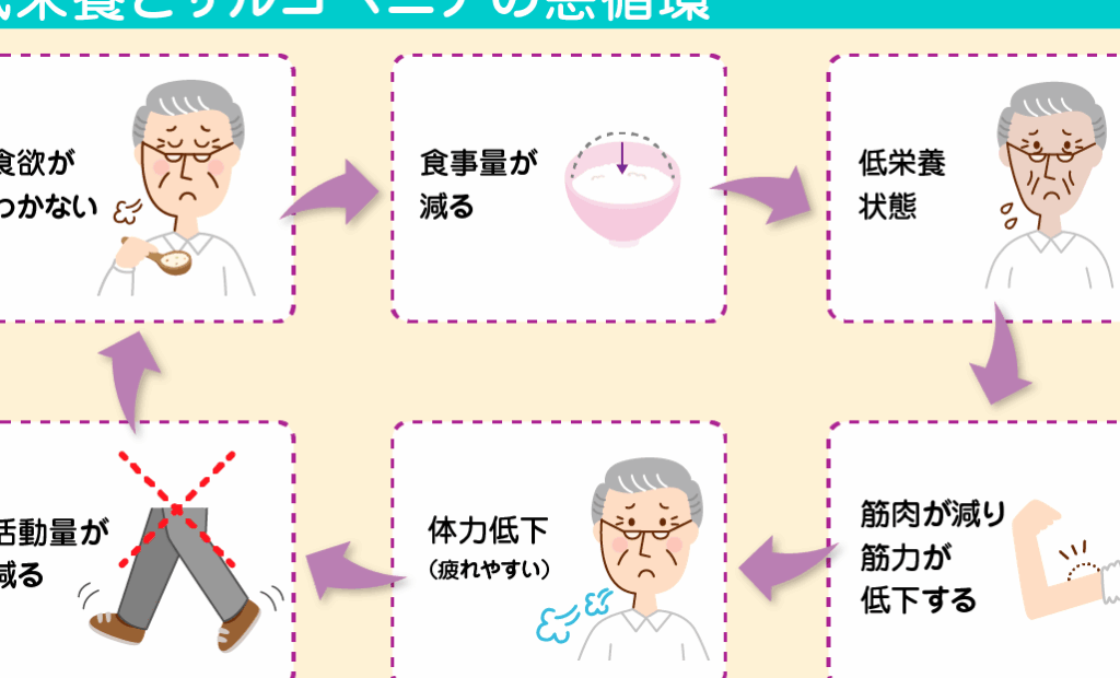 ウイルスや細菌に対する抵抗力が弱まるため、季節性インフルエンザや風邪にかかる頻度が上がる。ですので、適切なカロリー摂取は健康維持に欠かせない。