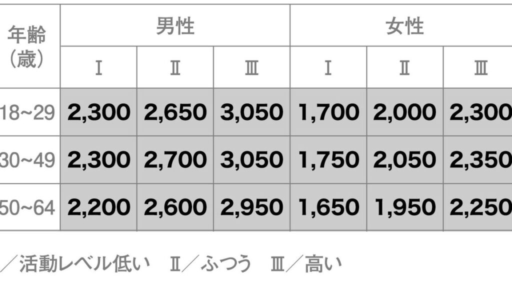 - Active(活発な生活): 約2400〜2800カロリー