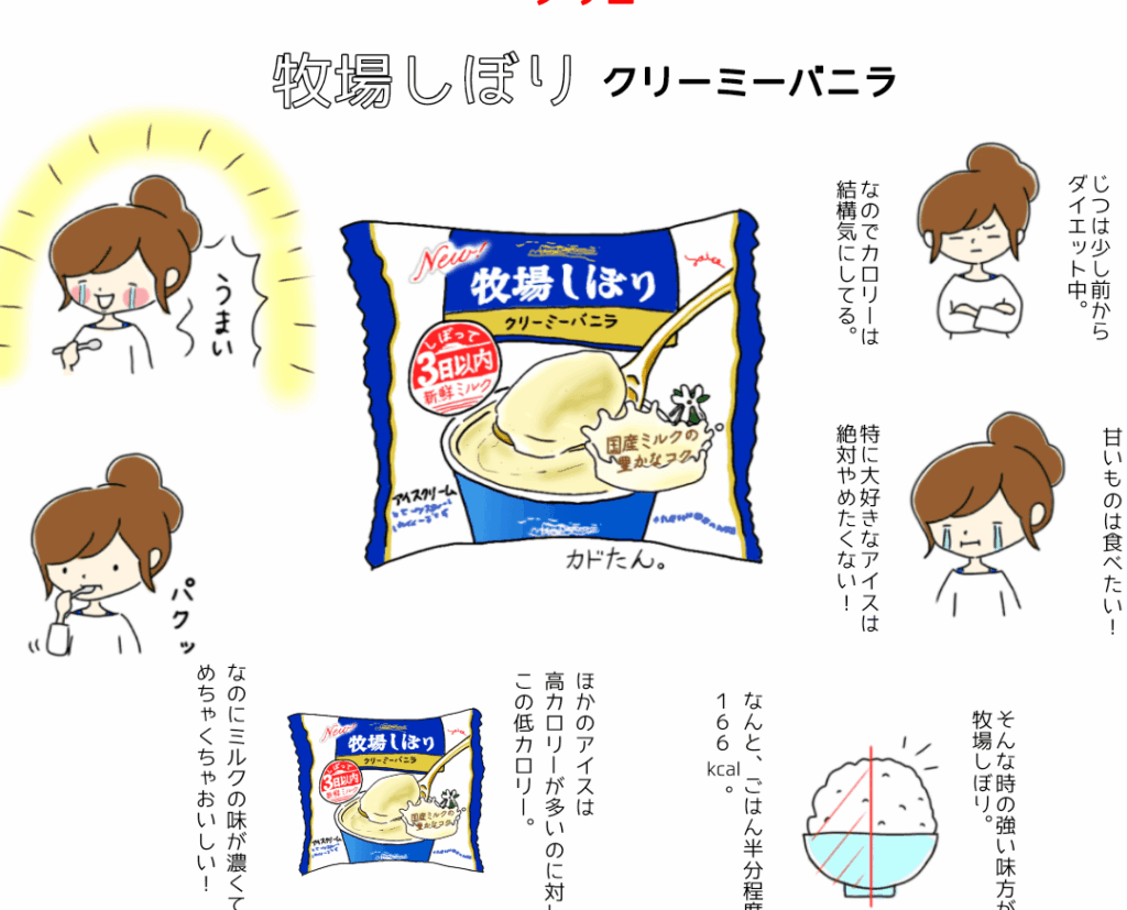 牧場しぼりは、自然な乳製品が主成分のアイスクリームで、甘さ控えめでクリーミーな味わいを実現しています。さまざまなフレーバーが揃うこのアイスクリームは、消費者に安心感を与える健康志向の商品です。特に低カロリーな点が、他のアイスクリームとは一線を画しています。