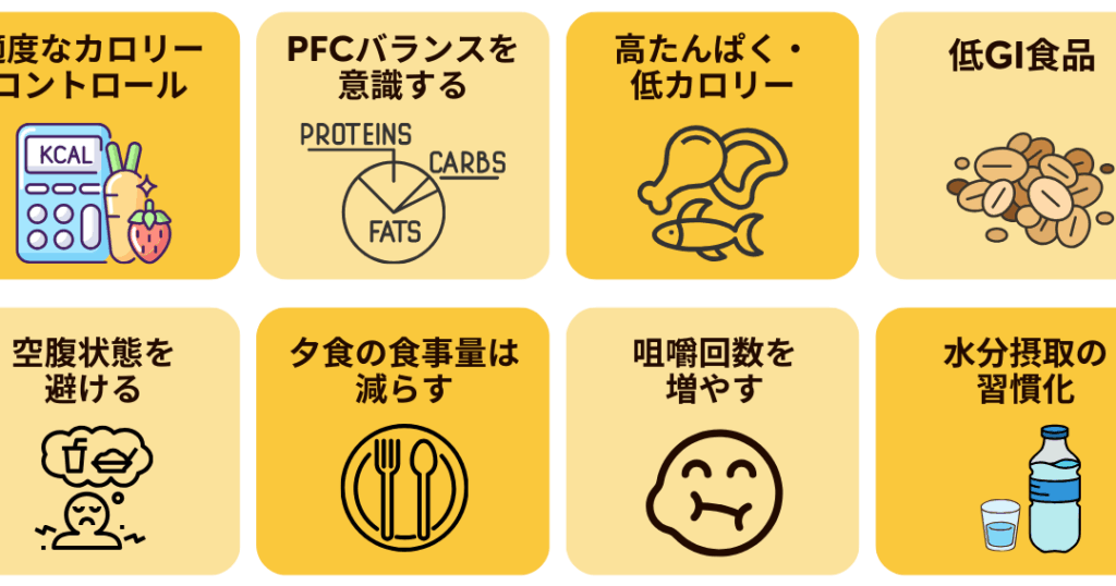 - カロリー制限: 日常のカロリー摂取量を把握し、必要に応じて減らします。具体的には1日の摂取カロリーを300〜500カロリー減らすことで、減量効果が期待できます。