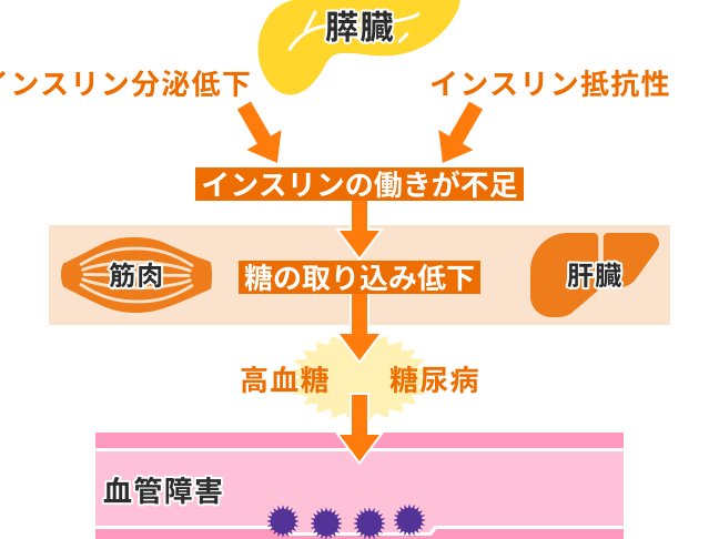 - 2型糖尿病: インスリンの抵抗性が生じ、血糖値が高くなります。生活習慣と関連性があります。