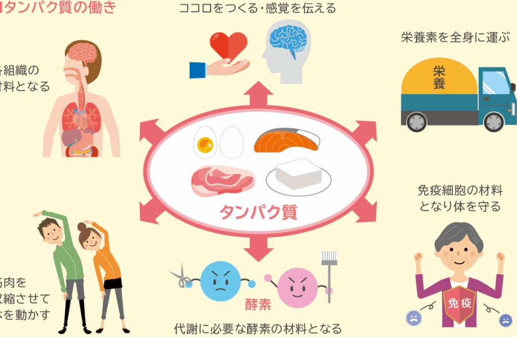 タンパク質は体内で多くの機能を果たします。まず、筋肉の構成要素として、運動能力や基礎代謝を支えます。また、ホルモンや酵素の生成にも関与し、免疫機能をサポートする役割も担っています。具体的には、以下の点が重要です。