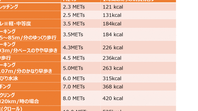 日常生活での活動によるカロリー消費も大事です。例えば、以下のような活動におけるカロリー消費量の目安を見てみましょう。