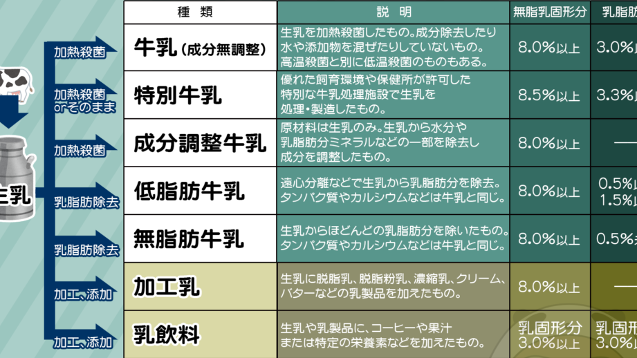 - 加工乳: 他の成分が加えられた牛乳で、風味や栄養価が異なります。
