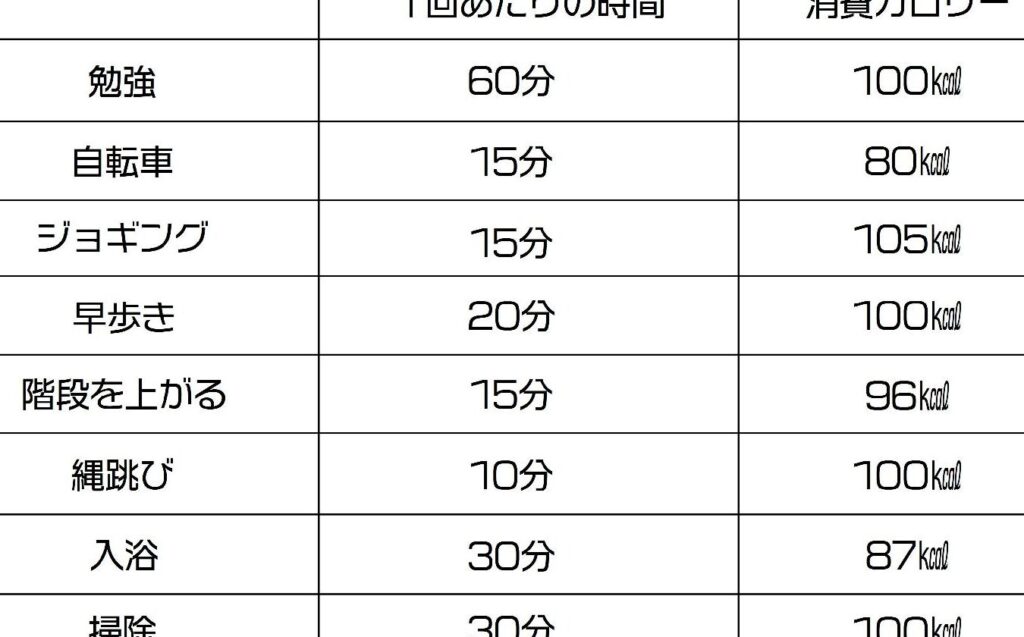 日常活動によっても、私たちは大きなカロリーを消費します。具体的には、歩行、掃除、家事、運動などが含まれます。活動レベルに応じた目安は以下の通りです。