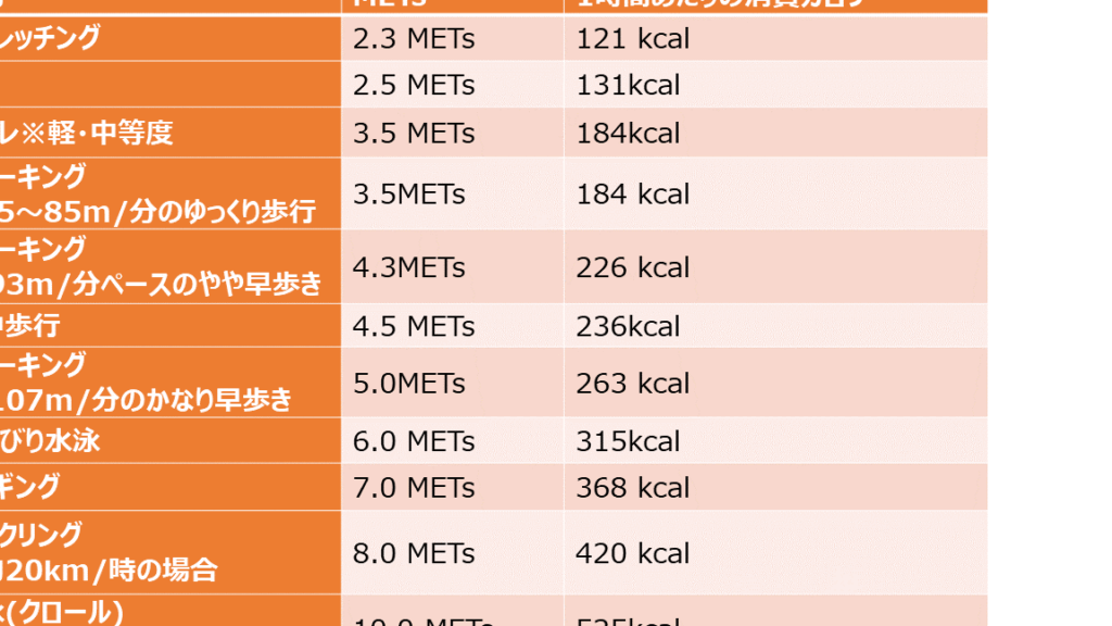 - 体重:体重が重いほど、消費カロリーが増加する