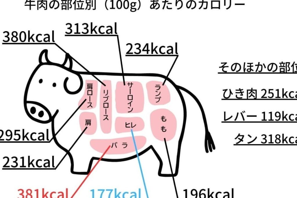 肉の部位によってもカロリーは異なる。特定の部位のカロリー比較を以下に示す。