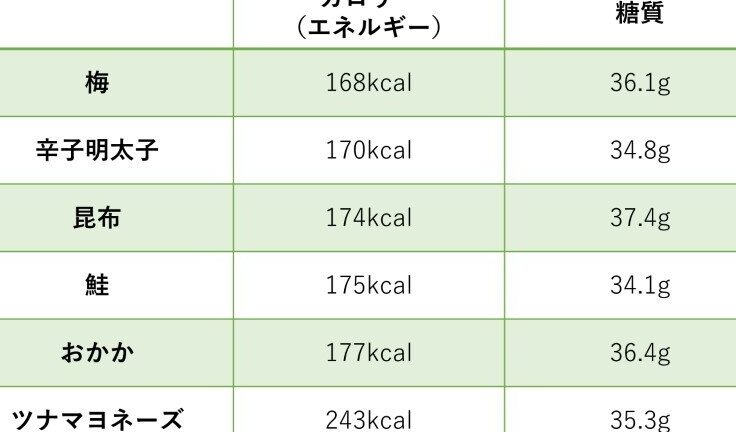 様々な具材が、おにぎりのカロリーに影響を与える。以下に、人気のある具材別のカロリーを示す。