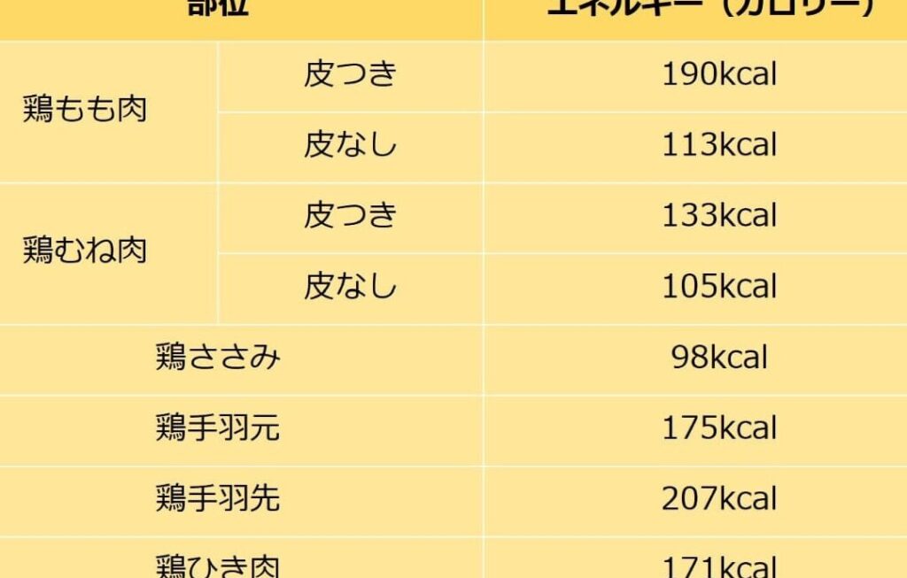 鶏もも肉のカロリーは、部位によって異なる。以下の表に部位別の具体的なカロリーを示します。